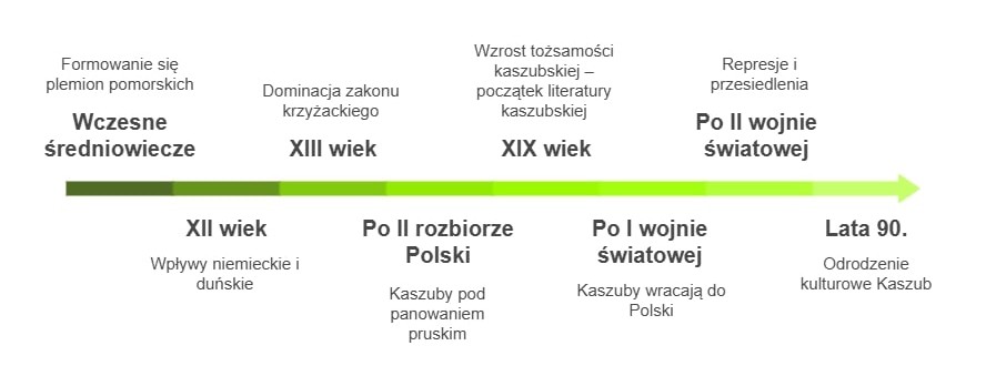 Dzieje Kaszubów są bardzo burzliwe i pełne ciekawych anegdot. Sięgają one wczesnego średniowiecza. W tym okresie na tych terenach żyły plemiona pomorskie. Z biegiem lat powstało Księstwo Pomorskie, które przez długi czas zmieniało granice i przynależność polityczną. Już wówczas kształtowała się odrębność językowa Kaszubów. Od XII wieku wpływy niemieckie i duńskie zaczęły odciskać swoje piętno na Pomorzu, a w XIII wieku pojawiła się ewidentna dominacja zakonu krzyżackiego. Mimo że część Kaszub znajdowała się w granicach państwa krzyżackiego, to ludność zachowała swoją indywidualność.